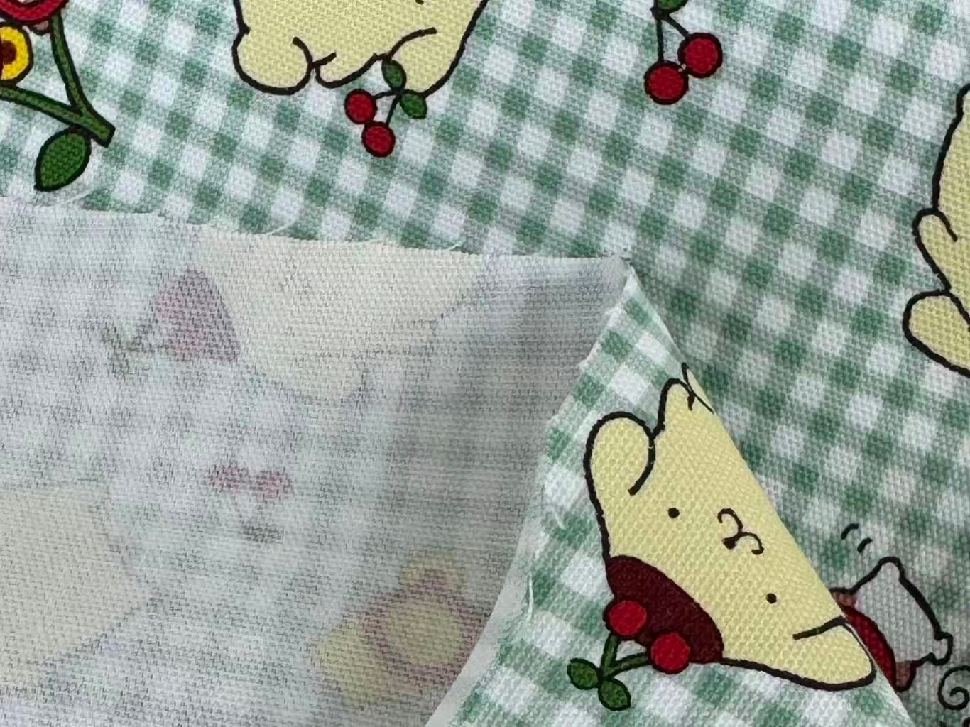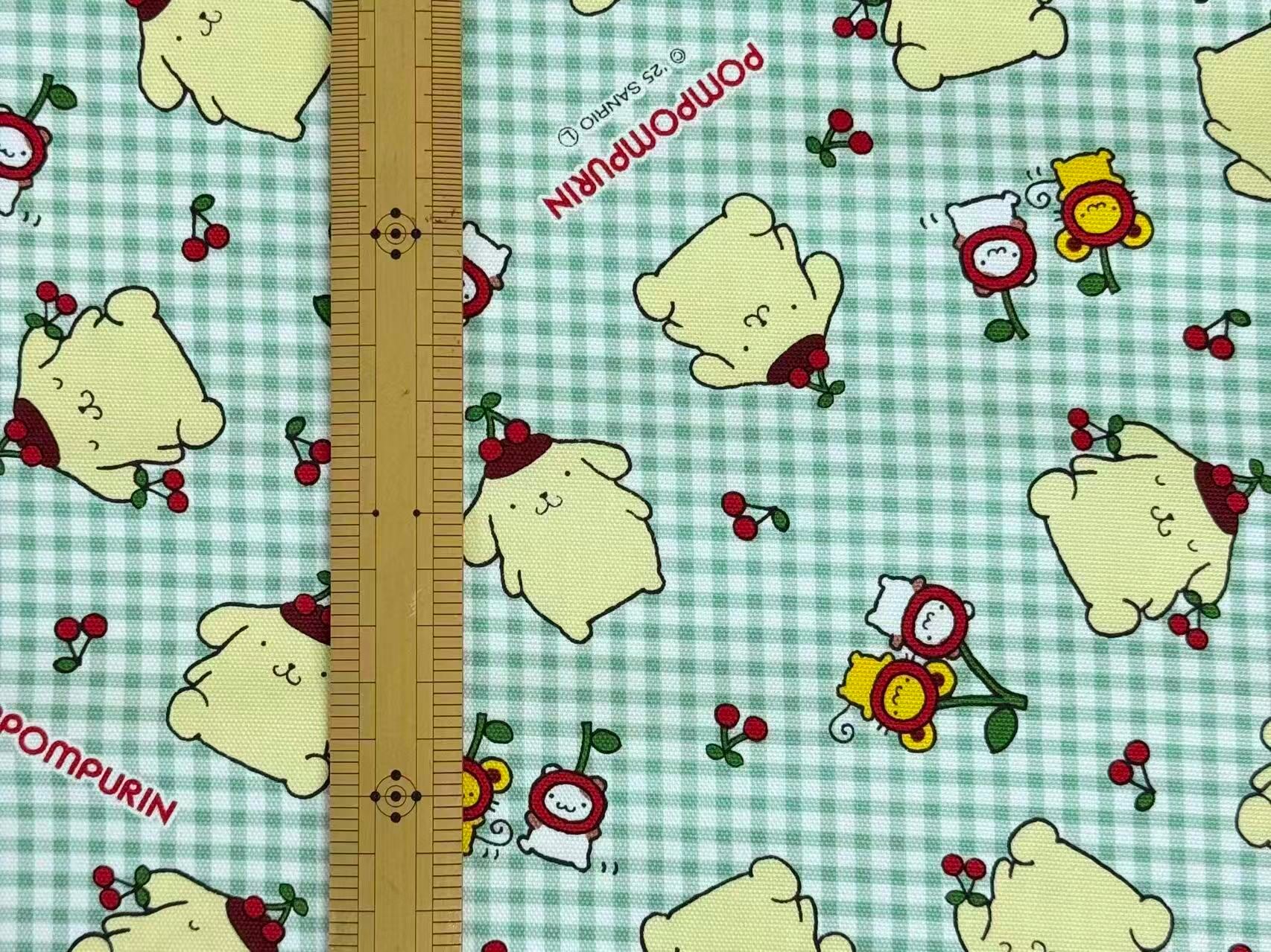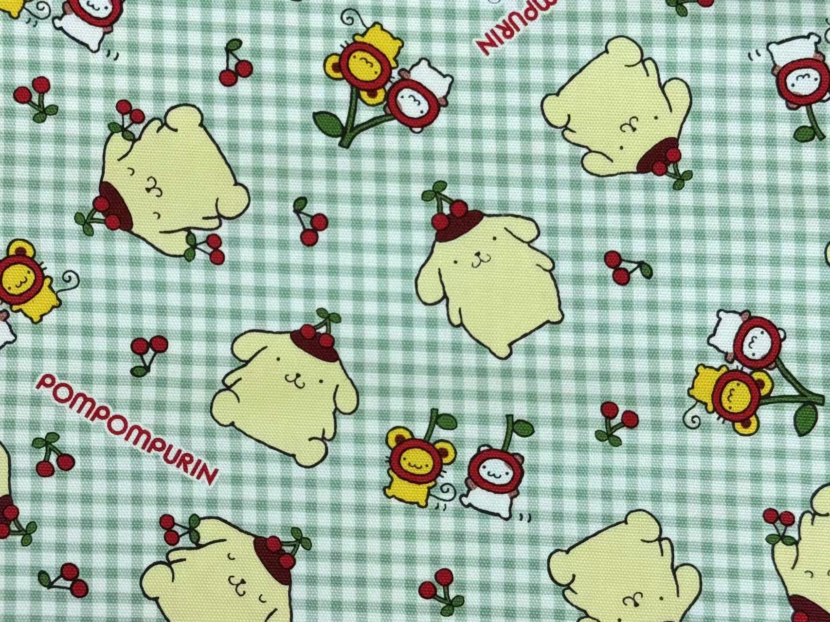明るいグリーンのチェック生地にサンリオ人気キャラクターポムポムプリンがたくさんちりばめられた、とてもキュートな生地です。初期デザインのポムポムプリンがチェリーと一緒に描かれ、どこか懐かしいカワイイ雰囲気の柄です。