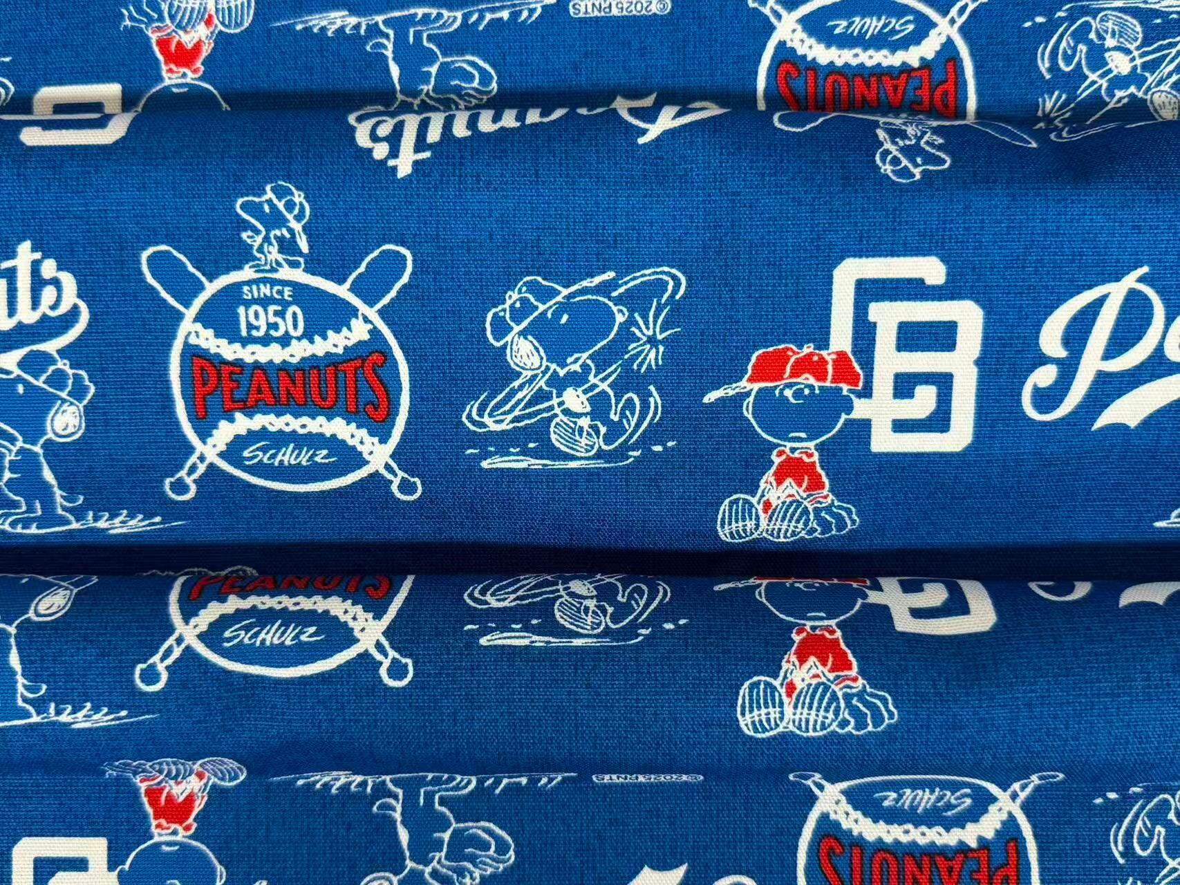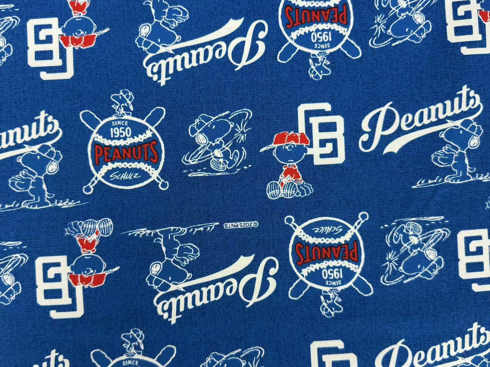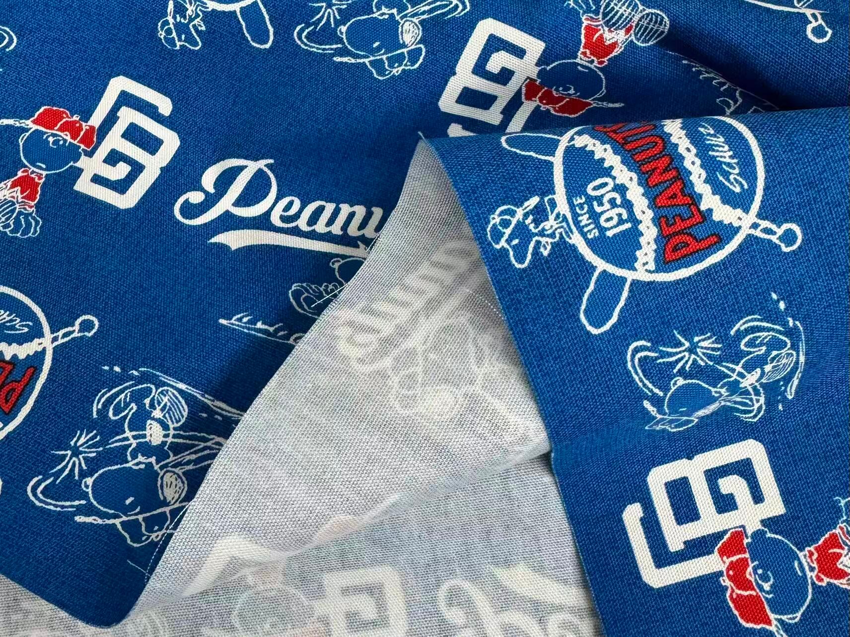 世界中で愛される「ピーナッツ」キャラクター、スヌーピーと仲間たちが、ベースボールをテーマにしたクラッシックデザインで表現されたプリント生地です。鮮やかなロイヤルブルーを基調に、ホワイトとレッドの差し色が映える、アクティブでレトロな雰囲気の生地です。